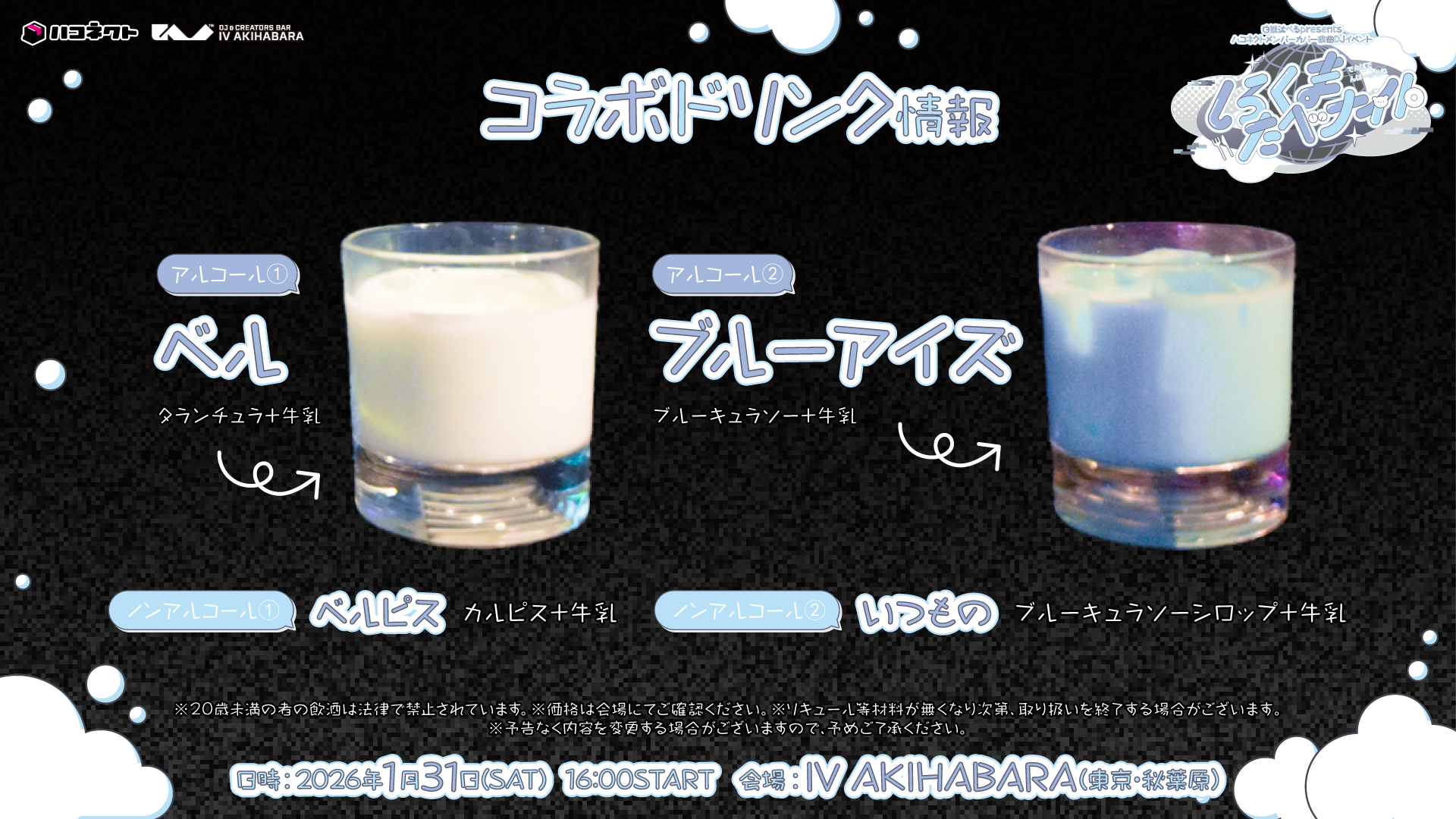 イベント当日会場バーカウンターにて、白熊汰べる考案のコラボドリンクの販売を販売いたします。